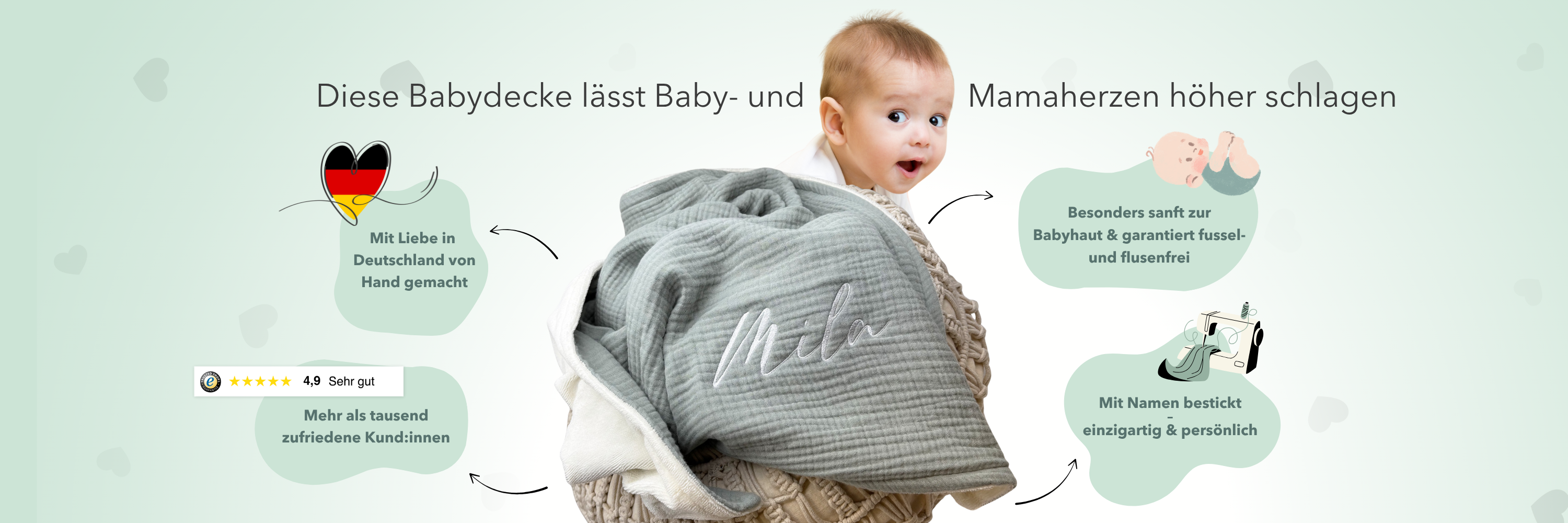 Sanft zur Babyhaut, pflegeleicht im Alltag und von Hand genäht in Deutschland.