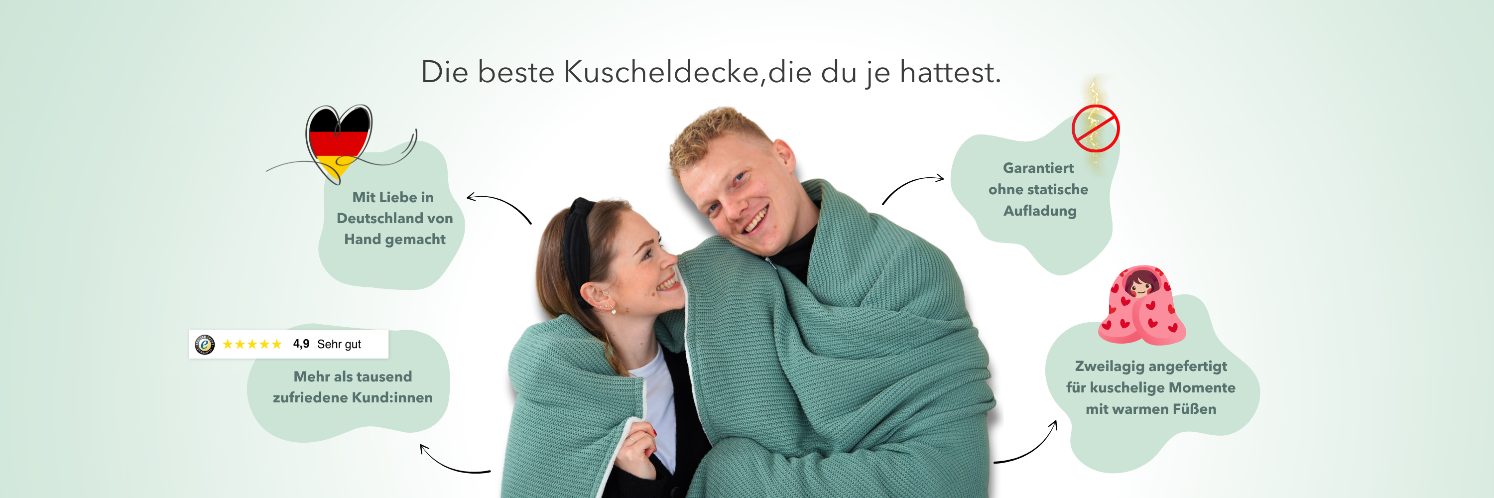 Mit warmen Füßen und gutem Gewissen entspannt auf dem Sofa einkuscheln. Alle Kuscheldecken werden aus zertifizierten Stoffen mit Liebe für dich in Köln produziert und sind garantiert ohne statische Aufladung. Ideal für dein ZuHause oder als ganz persönliches Geschenk mit Bestickung.
