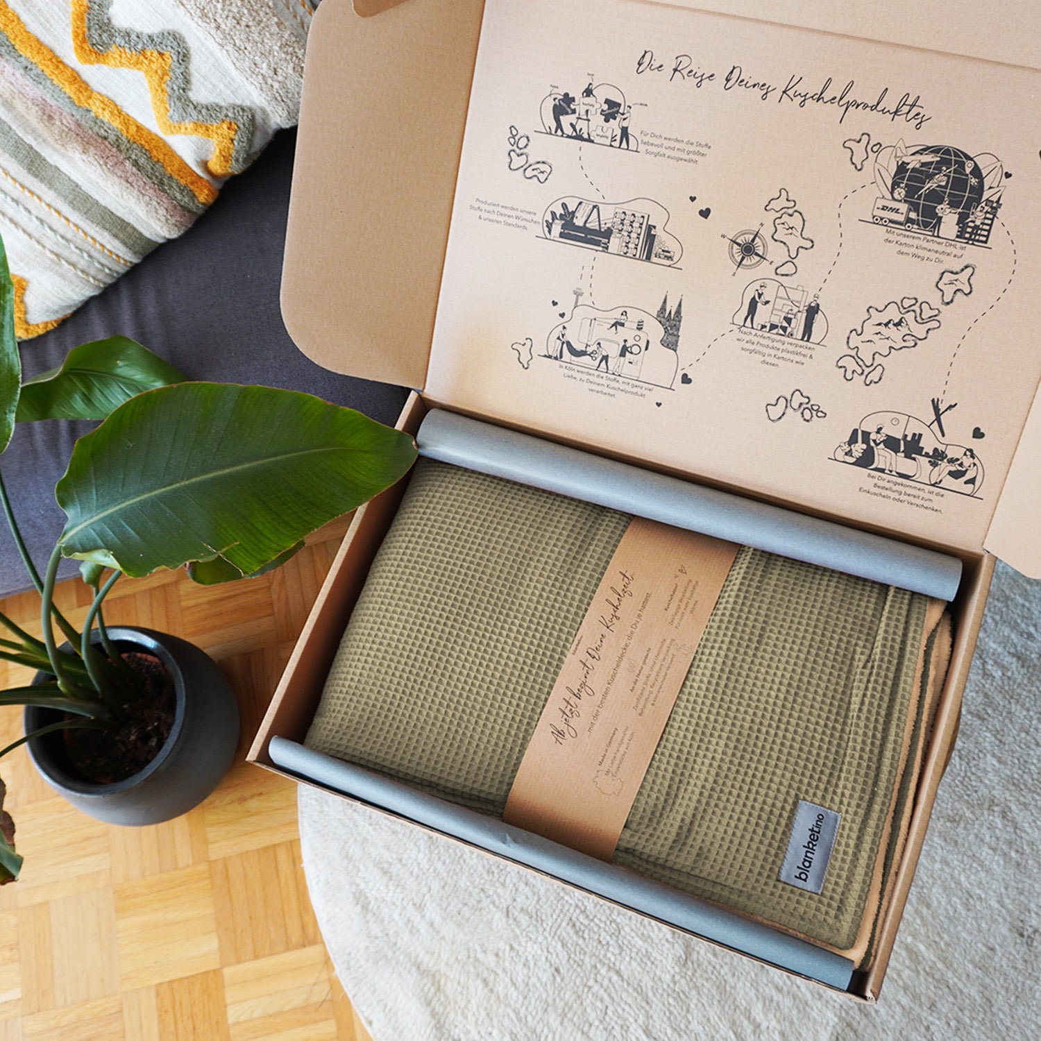 Du erhältst Dein Paket in plastikfreier Verpackung aus recycelten Materialien. Der Versand deiner "Kuscheldecke "Bambus"" erfolgt innerhalb von 2-3 Werktagen klimaneutral mit DHL GoGreen.