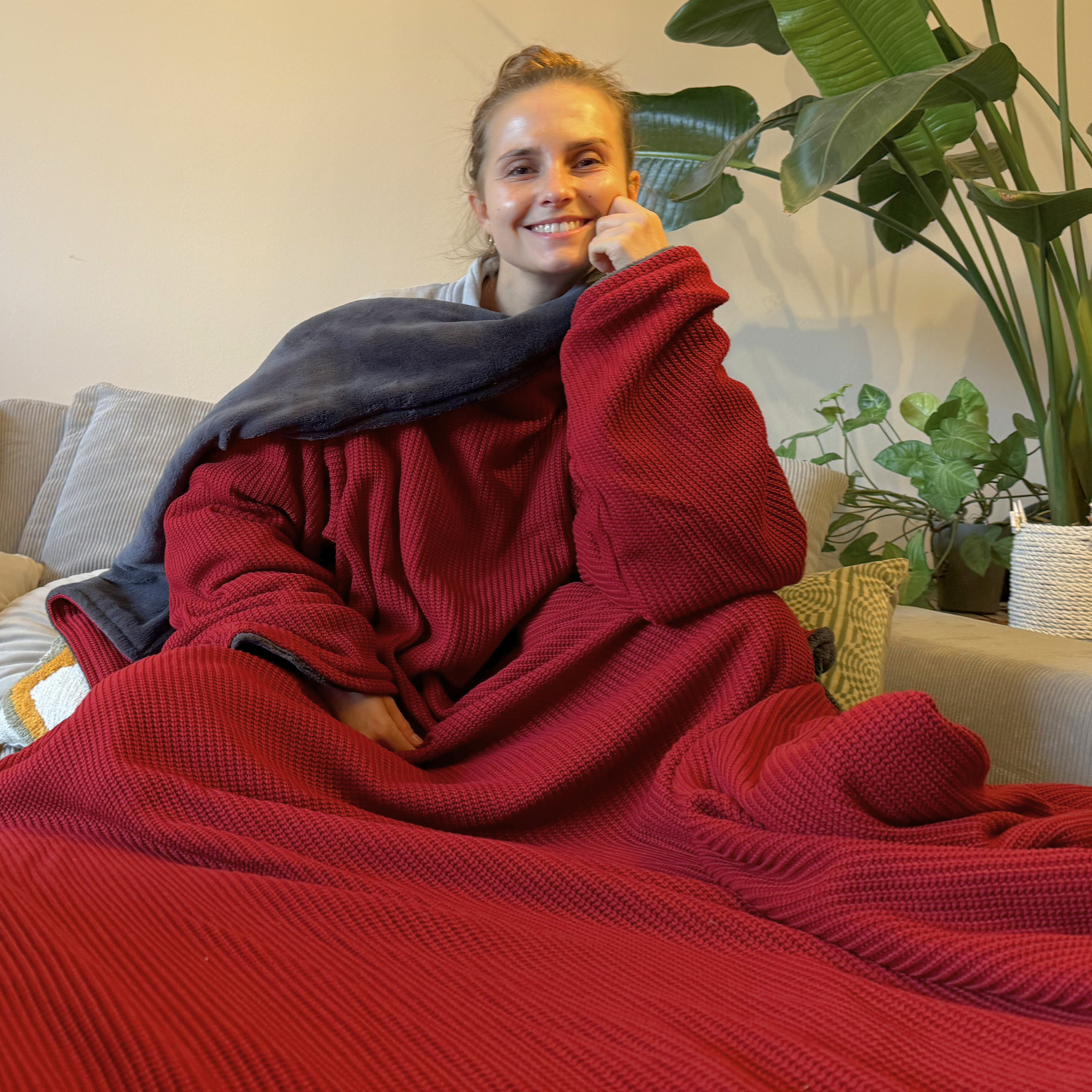 Kuscheldecke mit Ärmeln · Baumwollstrick · Weinrot