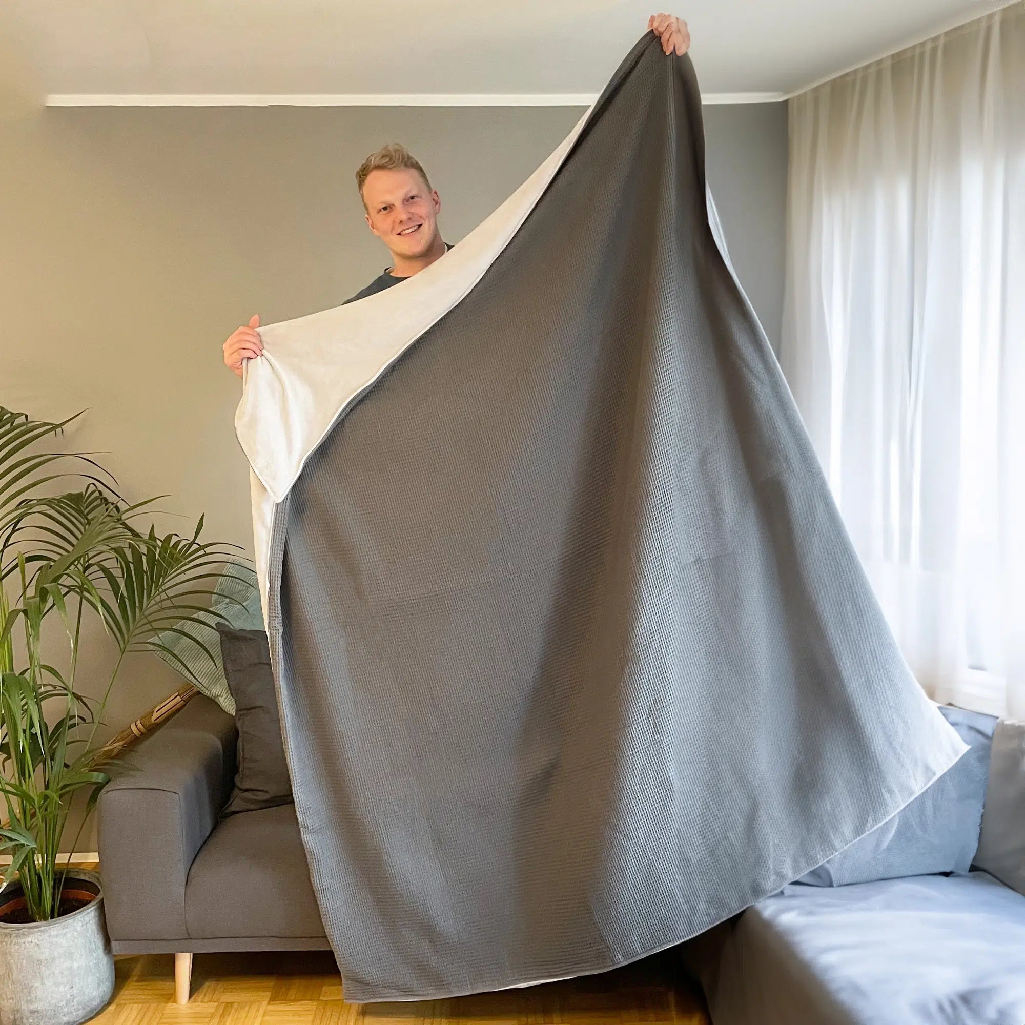Waffelpiqué – mit seiner charakteristischen Wabenstruktur bringt er eine angenehme Griffigkeit mit. Dabei ist er weich und sorgt durch seine besondere Textur für eine edle Optik und ein schönes Hautgefühl. Und das Beste: Wer es etwas kühler mag, kann die Decke einfach wenden und die atmungsaktive Waffelpiqué-Seite nutzen.