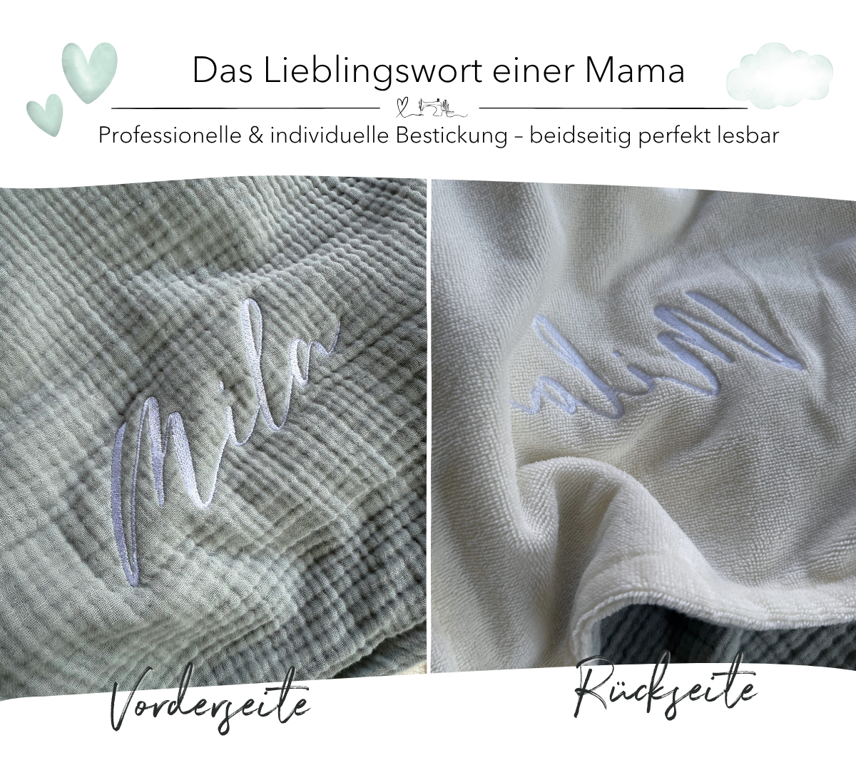 Unsere Musselin Babydecke werden in unserer kleinen Schneiderei mit Liebe in Köln genäht und auf Wunsch mit personalisiertem Stick für ein ganz besonderes Geschenk an Dich versendet.